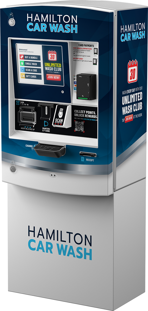HAMILTON HTKFHCCAAFBKZZZ HTK Paystation Kiosk, Free Standing Cabinet, Mars Cashflow Validator (USA), Two 4800 Capacity US Quarter Hoppers, Dual Bill Dispensers, Barcode Scanner, Door Wrap (Std), Std Controller, IDTech 6800 and Receipt Printer